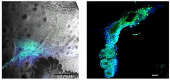 Compared to other glioma markers, such as the glial-transporter–specific dye ASP, which also labels glial cells []—BBG displays remarkable specificity, concentrating at or within glioma cells (Figure 3 and Figure 4). Unfortunately, the fluorescence of BBG is not well studied at all and needs many additional experiments to be determined scientifically, including quantum yields and stability [], and thus it is not easy to compare quantitatively to 5-ALA or SF.