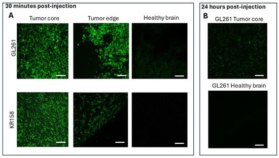 Tail-vein injections resulted in weak glioma staining (Supplementary Figure S3), likely due to first-pass hepatic metabolism reducing the tracer’s availability in systemic circulation [].