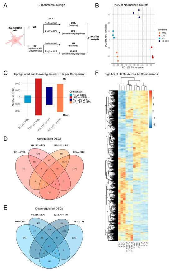 Optineurin loss and LPS induce distinct transcriptional programs in BV2 microglia. Differentially expressed genes (DEGs) were identified with DESeq2 (padj < 0.05, |log2FC| ≥ 0.5). (A) Schematic overview of the experimental design, showing the four conditions profiled by RNA-Seq: wild-type untreated control (CTRL), optineurin-knockout untreated (KO), wild-type + LPS (LPS), and optineurin-knockout + LPS (KO_LPS); created in BioRender. Munitić, I. (2025) https://BioRender.com/5l2stgi (accessed on 25 August 2025). (B) Principal component analysis (PCA) of variance-stabilized expression values from triplicate samples per condition. (C) Bar plot showing the number of significantly upregulated (positive y-axis) and downregulated (negative y-axis) DEGs for each pairwise comparison. (D,E) Venn diagrams show overlap of significantly upregulated (D, log2FC ≥ 0.5) and downregulated (E, log2FC ≤ –0.5) genes (padj < 0.05) across the indicated comparisons; directionality reflects labeled contrasts. (F) Unsupervised heatmap of the 7079 DEGs (padj < 0.05, |log2FC| ≥ 0.5) identified across all pairwise comparisons, with hierarchical clustering based on Euclidean distance of z-scored, variance-stabilized expression values.