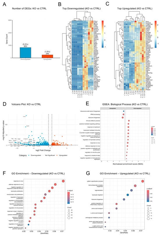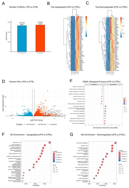 LPS reshaped a striking ~35% of the BV2 transcriptome. (A) Bar plot showing the number and percentage of DEGs in LPS vs. CTRL BV2 cells (padj < 0.05, |log2FC| ≥ 0.5). (B,C) Heatmaps of the top 50 most upregulated (B) and downregulated (C) genes in LPS vs. CTRL, ranked by combined score (−log10[padj] × |log2FC|). Rows represent genes; columns represent samples; values are z-scored variance-stabilized (rlog) counts. (D) Volcano plot shows significantly up- and downregulated DEGs ranked by log2FC, with top 50 DEGs labeled. (E) GSEA bubble plot (GO Biological Process) showing the top enriched terms in up- and downregulated genes. (F,G) GO overrepresentation dot plots; dot size = GeneRatio (query genes in term/term size). Only the top 15 enriched terms for upregulated (F) and downregulated (G) gene sets are displayed.