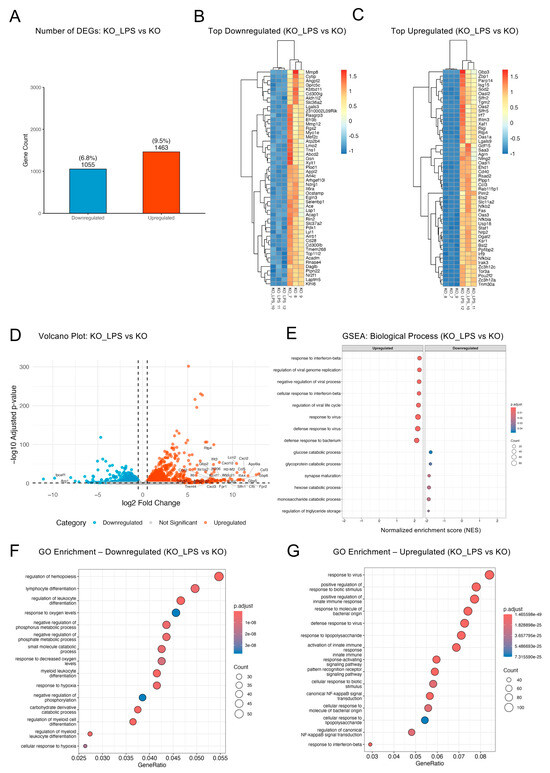 Optineurin loss reshaped the LPS-induced transcriptome by partially preserving immune activation but altering metabolic programs. (A) Bar plot showing significantly up- and downregulated genes in KO_LPS vs. KO (padj < 0.05; |log2FC| ≥ 0.5) using DESeq2. (B,C) Heatmaps of the top 50 downregulated (B) and upregulated (C) genes ranked by combined score (−log10[padj] × |log2FC|). Values are z-scored variance-stabilized (rlog) counts; samples and genes are hierarchically clustered. (D) Volcano plot shows significantly up- and downregulated DEGs ranked by log2FC, with top 50 DEGs labeled. (E) GSEA bubble plot (GO Biological Process) shows the top enriched pathways. (F,G) GO overrepresentation dot plots; dot size = GeneRatio (query genes in term/term size). Only the top 15 enriched terms for downregulated (F) and upregulated (G) gene sets are displayed.