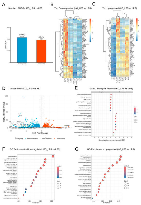 Optineurin influenced inflammatory and cell cycle gene regulation in response to LPS. (A) DEG counts for KO_LPS vs. LPS (padj < 0.05; |log2FC| ≥ 0.5); percentages and gene numbers are shown. (B,C) Heatmaps showing the top 50 most downregulated (B) and upregulated (C) genes; values are z-scored variance-stabilized (rlog) counts; samples and genes are hierarchically clustered. (D) Volcano plot shows significantly up- and downregulated DEGs ranked by log2FC, with top 50 DEGs labeled. (E) GSEA plot (GO Biological Process) highlights enriched pathways among up- and downregulated genes. (F,G) GO overrepresentation analyses of downregulated (F) and upregulated (G) gene sets. Only the top 15 enriched terms for downregulated (F) and upregulated (G) gene sets are displayed.