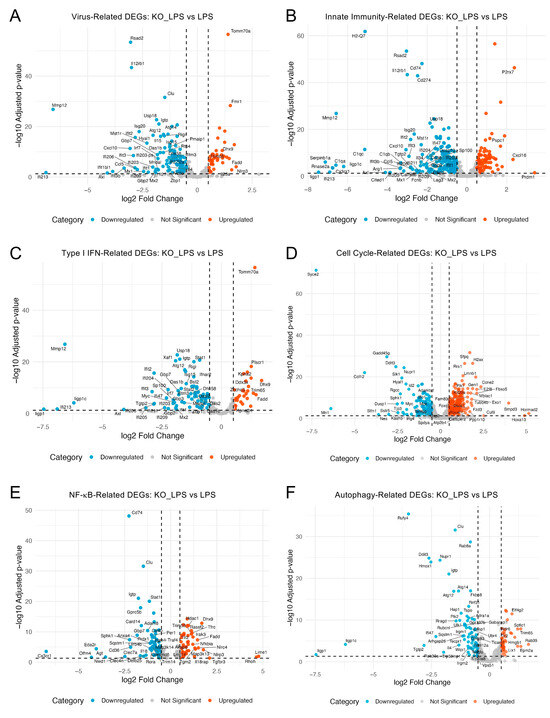 Targeted transcriptional profiling of functional gene sets in KO_LPS vs. LPS. (A–F) Volcano plots display differentially expressed genes from selected functional categories enriched in the KO_LPS vs. LPS comparison. Virus- (A), innate immunity- (B), type I interferon- (C), cell cycle- (D), NF-κB- (E), and autophagy-related (F) DEGs are shown. Gene sets were defined based on GO BP terms. Top 50 DEGs (padj < 0.05), ranked by log2fc are labeled.