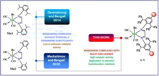 In this work, we report the synthesis and characterization of novel manganese complexes of the general formula [Mn(DAB)(CO)3Br] bearing bulky yet flexible DABs, i.e., ligands that are capable of adjusting their steric hindrance towards incoming substrates and, at the same time, are able to stabilize low-valent species (Figure 1). The properties of the synthesized complexes were also compared with those of known manganese compounds not charged with steric hindrance, previously described in the literature. The catalytical activities of novel Mn complexes were evaluated in the hydroboration process of carbonyl compounds, highlighting their efficiency under mild conditions and their potential to serve as green alternatives to traditional noble metal-based systems.