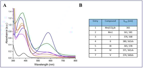 Electronic absorption spectra of [Mn(CO)5Br] (black) and complexes Mn1 (navy), I (olive), II (blue), III (orange), IV (magenta) and V (red), in dichloromethane at ~10−4 M (A). Numerical values of maximum absorption wavelengths are given (B).