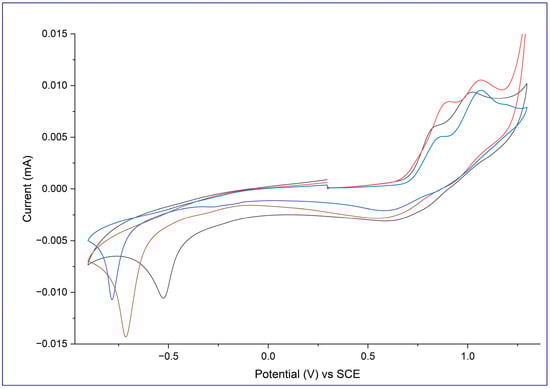 The electrochemical properties of Mn(I) complexes I, III and V were investigated by cyclic voltammetry (Figure 3). These three compounds were selected as representative examples, capturing the range of structural features present in the full series. The aim was to assess the redox behavior of the complexes. A 0.1 M solution of tetrabutylammonium perchlorate (TBAClO4) in dry acetonitrile was used as the supporting electrolyte. Measurements were performed on a three-electrode setup using a platinum working electrode (ϕ = 2 mm), an Ag/Ag+ reference electrode, and a platinum wire as the counter electrode. The cyclic voltammograms of all three compounds were similar and showed two oxidation waves: a quasi-reversible one, likely associated with the Mn(I)/Mn(II) redox couple [], and an irreversible one, probably attributed to the electrochemical oxidation of the ligand [,]. In addition, a single irreversible reduction wave was observed, probably corresponding to the formation of a radical anion on the ligand []. Notably, the reduction potential shifted to more negative values, from −0.53 V for V to −0.71 V for III and −0.78 V for I, indicating that ligand reduction becomes increasingly difficult in the presence of electron-donating substituents [,]. The complexes were found to be unstable upon electroreduction and underwent decomposition.