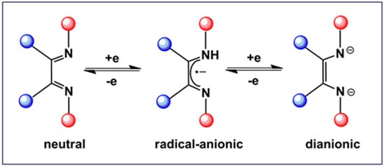 Since the first synthesis of an α-diimine [], molecules containing the 1,4-diaza-1,3-butadiene skeleton have attracted much interest because of both their versatile coordination behavior and the interesting properties of their metal complexes []. The simplest representatives of this class of compounds are 1,4-disubstituted 1,4-diaza-1,3-butadienes (α-diimines, DAB or R-DAB), which not only have a flexible N=C-C=N skeleton, but also have coordination properties as compared to the others, frequently using bidentate nitrogen donors, such as bis(imino)acenaphthene (BIAN), 2,2′-bypirydine (bipy) or phenanthroline (phen). They can coordinate to metal centers via both lone pairs of nitrogen atoms and double C=N bonds, thereby showing the ability to form a gamut of complexes in different oxidation states [,]. DAB ligands also have distinctive redox characteristics [] as well as low-lying and long-lived metal-to-ligand charge transfer (MLCT) excited states []. They can accept one or two electrons upon reduction, thereby converting into the radical-anionic or dianionic (enediamido) form, respectively (Scheme 1).