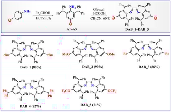 The first step of our study was the synthesis of five 1,4-diaza-1,3-butadienes containing sterically crowded substituents localized at both nitrogen atoms (DAB_1–DAB_5). Syntheses of these ligands were accomplished in two steps starting from a commercially available reagent [,] (Scheme 2):