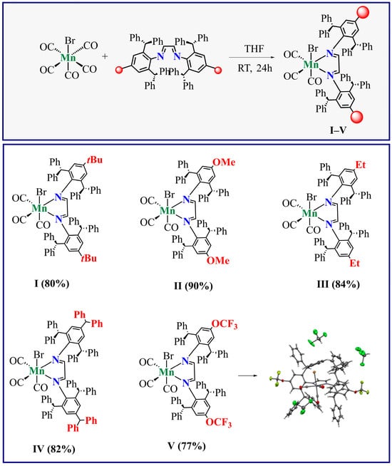 In the next step, we applied the obtained ligands for the synthesis of new manganese complexes, according to the procedures described by Bengali’s group [] with modifications (Scheme 3). Complexes I–V were obtained by exchanging two of the carbonyls (CO) from the commercially available bromopentacarbonylmanganese(I) [Mn(CO)5Br] with the appropriate DAB ligands. The syntheses were carried out under an inert gas atmosphere and in the absence of light, because of the photosensitivity of the compounds. In the same manner we obtained a known complex containing a less sterically encumbered N,N-donor ligand (Mn1) []. Comparison of the catalytic activity of analogous DAB-Mn systems containing non-crowded and fully-crowded substituents at the donor atoms was aimed at determining the influence of the size of the substituents on the nature of the complexes. All coordination compounds were isolated as dark violet or blue solids in yields above 77% and characterized using spectroscopic and mass spectrometric techniques. Moreover, the structure of complex V was unambiguously confirmed by XRD analysis of a single crystal obtained by dissolving this compound in dried chloroform followed by slow evaporation of the solvent (Scheme 3; see Supplementary Materials for details). The complex crystallizes in the monoclinic space group P21/c. The manganese center adopts a distorted octahedral coordination geometry coordinated by two nitrogen atoms from the DAB ligand, three carbon atoms from carbonyl ligands, and one bromide anion. The Mn-N bond lengths are 2.108(3) Å and 2.055(3) Å, consistent with values reported for related manganese complexes [,,]. The N-Mn-N bite angle is 77.7(1)°. Analysis of the crystal packing reveals the presence of chloroform solvent molecules, with several short intermolecular C-Cl···H and C···Cl contacts. The crystal structure of compound V shows a facial arrangement of the CO ligands, and the relative intensities of the three CO stretching bands observed in the IR spectrum are consistent with this geometry.
