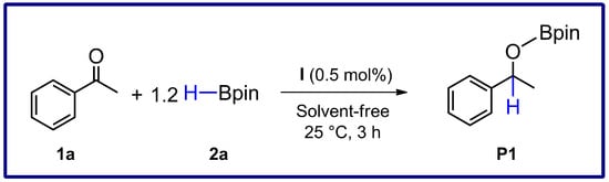 We started the catalytic stage of our study with a number of tests using the same conditions as those described for Mn(CO)5Br in the paper by Walkowiak’s group []. Preliminary experiments were carried out with the use of acetophenone (1a) and pinacolborane (2a, HBpin) as model reactants. Treatment of the mixture of 1a and 2a in a molar ratio of 1 to 1.2 with 0.5 mol% of catalyst I resulted in complete conversion of ketone after 2 h and the formation of a single product, which was identified by GC-MS and 1H NMR spectroscopy as 4,4,5,5-tetramethyl-2-(1-phenylethoxy)-1,3,2-dioxaborolane (P1) (Scheme 4).