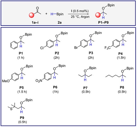 Hydroboration of ketones (1a–i) (experimental conditions: solvent-free, 25 °C, [1a–i]:[2a] = 1:1.2, [I] = 0.5 mol%, argon). Reaction times are given for each product under its respective structure. Quantitative yields of all products (P1–P9) were obtained.