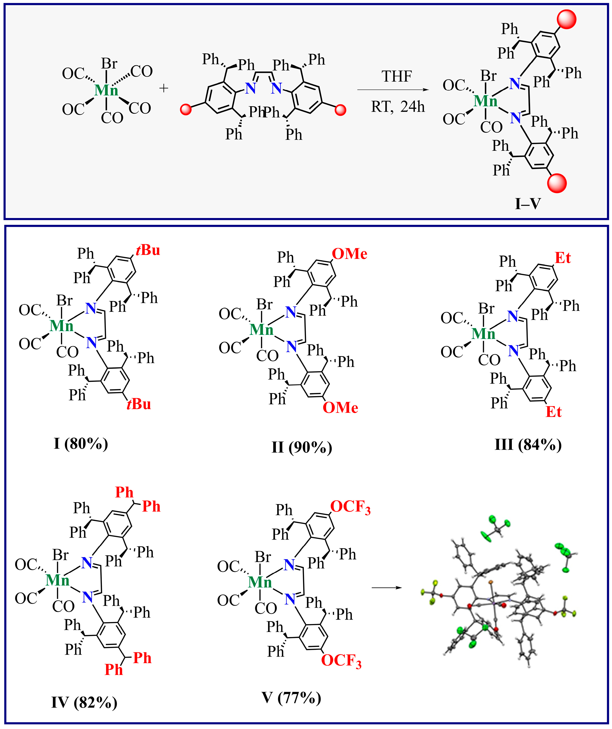- Kanno, T.; Takaseb, T.; Oyamab, D. Synthesis and crystal structures of manganese(I) carbonyl complexes bearing ester-substituted a-diimine ligands. Acta Cryst. 2020, E76, 1433–1436. [Google Scholar] [CrossRef] [PubMed]