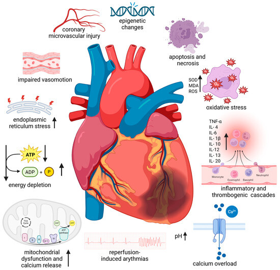 Coronary heart disease (CHD) is one of the most common causes of morbidity and mortality worldwide [1]. The term myocardial ‘ischemia–reperfusion injury’ (IRI) is closely associated with CHD. Despite its crucial importance for cardiac cell survival, reperfusion initiates a wide and complex range of responses in the body (Figure 1) [2]. These responses can both exacerbate local damage and induce impairment of general body functions. Conditions leading to CHD include various forms of acute vascular occlusion (stroke, myocardial infarction, limb ischaemia) along with appropriate reperfusion strategies (thrombolytic therapy, angioplasty, surgical revascularisation). Routine surgery, organ transplantation, tissue transfer, cardiopulmonary bypass, vascular surgery, and trauma/shock may also be associated with tissue IRI [3]. Over the past few decades, substantial research has been conducted on the mechanisms that control necrosis and apoptosis, as well as the extensive investigation of cardioprotective processes [4].
