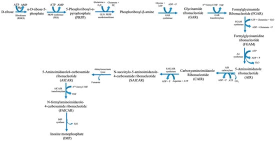 - Pareek, V.; Pedley, A.M.; Benkovic, S.J. Human de Novo Purine Biosynthesis. Crit. Rev. Biochem. Mol. Biol. 2021, 56, 1–16. [Google Scholar] [CrossRef]