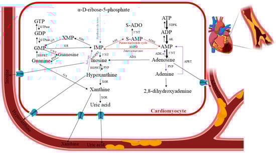 Myocardial ischemia results in an inadequate blood supply to the heart tissue, leading to morphological and functional abnormalities. It develops when the heart’s fractional consumption of oxygen is inadequate to sustain the rate of cellular oxidation. This oxidative stress can lead to necrosis and apoptosis in cardiomyocytes, as well as damage to cellular proteins. Moreover, reduced local perfusion causes severe dysfunctional changes, such as myocardial stunning, myocyte death, reperfusion arrhythmia, oedema, and numerous other consequences stemming from a vicious loop of vascular, endothelial, and mitochondrial malfunctions [9]. Clinical and experimental evidence indicate that the major processes leading to tissue and cell dysfunction are primarily associated with reperfusion [10]. To accommodate chronic low myocardial hibernation and preconditioning, the ischemic tissue and the rest of the body may undergo biochemical and molecular adaptive modifications. Chronic ischemia develops gradually and silently over months or years. It damages most of the body’s organs. The pathophysiology of ischemia–reperfusion injury has been extensively studied over the past 40 years, and current therapeutic strategies attempt to incorporate a wide range of factors, including the impairment of endothelial relaxation following ischemia–reperfusion, reduction of reperfusion injury through the scavenging of free radicals, and inhibition of neutrophil adhesion and activation [11,12]. Due to the high oxygen dependence of this vital aerobic process, there are significant metabolic ramifications from coronary circulation disruption or reduction, which lowers the oxygen supply to the affected area of the heart (ischemia), as well as from other forms of hypoxia (a lack of oxygen in the heart tissues) caused by environmental factors, demand/supply imbalances, etc. During episodes of restricted blood flow, like myocardial infarction, the heart’s energy stores are depleted, leading to tissue damage [7]. After a brief period of ischemia, the heart can only slowly replenish its adenine nucleotide pool. It was found that normal ATP levels were not restored until several days after reperfusion [13]. This phenomenon, functionally known as stunned myocardium, is caused by the ability of ATP degradation products produced during ischemia to permeate the cell membrane (Figure 3). They are removed from the heart and washed out, making them unavailable for instant intracardiac reutilization through salvage pathways. ATP and phosphocreatine are rapidly depleted at the onset of myocardial ischemia/hypoxia. After 15 min of total ischemia, the heart tissues would lose 65% of their ATP levels [14]. Adenosine diphosphate (ADP) and adenosine monophosphate (AMP) are two ATP catabolic byproducts produced during ischemic events. Additionally, these events activate enzymes that are normally dormant, such as purine nucleoside phosphorylase (PNP), adenosine deaminase (ADA), 5′-nucleotidase (5′NT), and xanthine oxidoreductase (XOR), which catabolize AMP into adenosine, inosine, hypoxanthine, xanthine, and uric acid [15,16,17,18,19,20,21]. After ischemia, ATP levels are restored by the adenine nucleotide de novo synthesis pathway, which depends on the availability of phosphoribosyl pyrophosphate, and the purine salvage system, which depends on adenosine, adenine, and hypoxanthine as substrate precursors [22,23,24,25,26]. Consequently, ischemia–reperfusion injury research must be up-to-date with the status of drug protection so that translational research efforts can be optimised to turn this information into novel human therapies [27].
