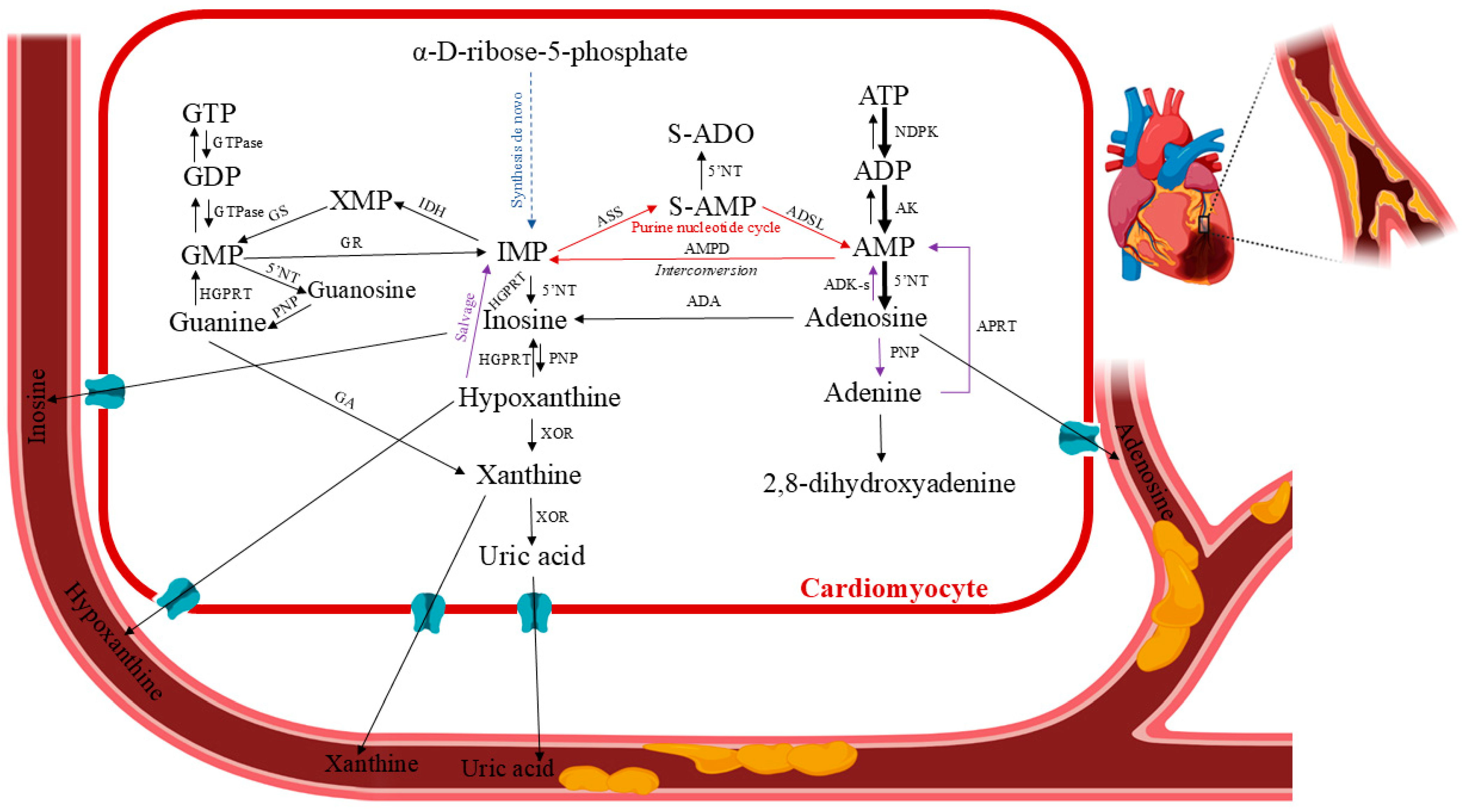 | Hypoxanthine | The development of the high-pressure liquid chromatographic system for the determination of purine nucleosides in the blood. | Increased ischemic heart’s synthesis of hypoxanthine was detected. | The high-pressure liquid chromatographic assay of blood hypoxanthine as a useful tool in the diagnosis of ischemic heart disease. | Harmsen, E.; 1981 [59] |