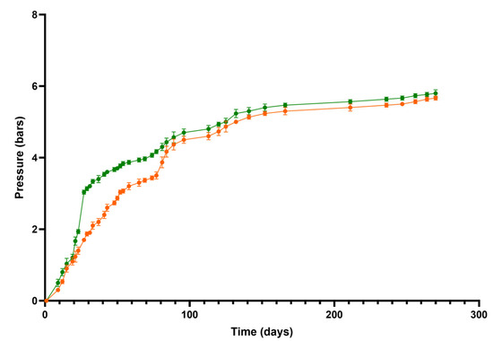 Monitoring of the second fermentation produced by CO2 pressure carried out by yeast strains: wine fermented with strain G1 (orange) and wine fermented with strain N62 (green).