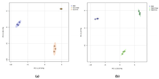 Principal component analysis (PCA) carried out from the data matrix of the metabolites quantified (a) base wine (BW, blue), wine with G1 strain at 3 bars of pressure (G1-3 bar, ocher), and wine with strain G1 at 9 months (G1-9 m, orange) (b) base wine (BW, blue), wine with N62 strain at 3 bars of pressure (N62-3 bar, light green), and wine with strain N62 at 9 months (N62-9 m, green).