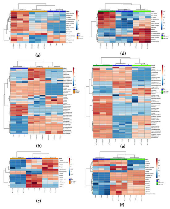 Visualization of the heat map of the quantified and normalized data of the different wines. Base wine (BW, blue), wine inoculated with G1 at 3 bar pressure (G1-3 bar, ocher), wine inoculated with G1 at 9 months (G1-9 m, orange), wine inoculated with N62 at 3 bar pressure (N62-3 bar, light green), and wine inoculated with N62 at 9 months (N62-9 m, green). (a–c) Major volatile compounds and polyols, minor volatile compounds, and nitrogen compounds of wine with G1, respectively. (d–f) Major volatile compounds, minor volatile compounds, and nitrogen compounds of wine with N62, respectively.