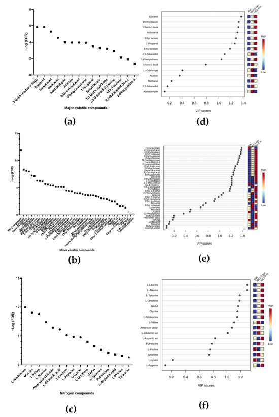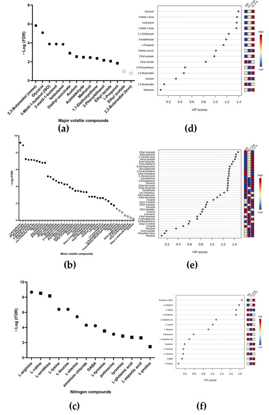 Analysis of ANOVA and Fisher’s test (a–c) between metabolites of base wine (BW), wine inoculated with N62 at 3 bar pressure, and wine inoculated with N62 at 9 months. The circles indicate that the metabolite shows significant differences between the three wines. The squares indicate that the metabolite shows no significant differences between two wines, but they do show differences between the third wine. The triangles indicate that the metabolite shows significant differences between only two wines. The gray circles indicate that the metabolite shows no significant differences between any wines. (d–f) The analysis of the variables of importance in the projection between metabolites of BW, wine inoculated with N62 at 3 bar pressure, and wine inoculated with N62 at 9 months.