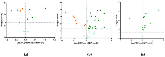 Volcano plot of metabolites at nine months with significant differences at q-value < 0.05. Upregulated metabolites with strain N62 correspond to the green spheres (LFC > 0), and the upregulated metabolites with strain G1 correspond to the orange spheres (LFC < 0). Metabolites without significant differences are shown in light green. (a) Comparison of major volatile compounds and polyols. (b) Comparison of minor volatile compounds. (c) Comparison of nitrogen compounds.