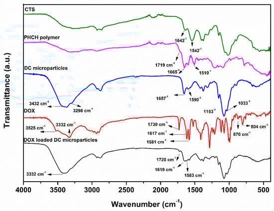 FTIR spectra of CTS, PHCH, DC microparticles, DOX, and DOX-loaded DC microparticles.