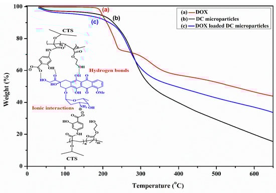 TGA thermograms of (a) DOX, (b) DOX-loaded DC microparticles, and (c) DC microparticles (the inset shows a schematic representation of the interactions between DOX and the PHCH polymer, illustrating both ionic and hydrogen bond interactions).