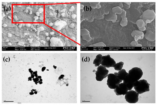 SEM images at different magnifications of DC microparticles (a,b); TEM images of the same (c,d).