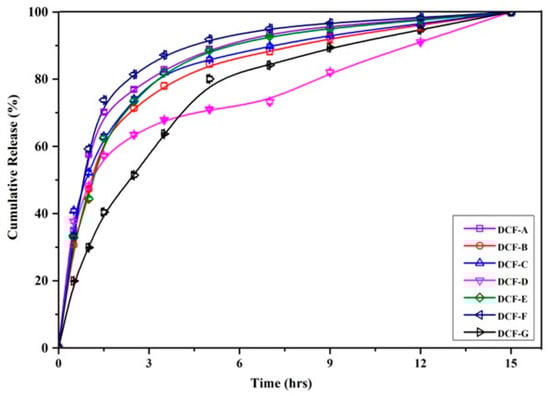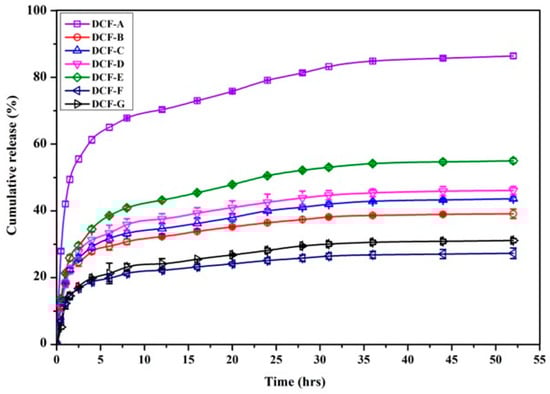DOX release kinetics of DC microparticles were studied with phosphate buffer saline using a bath method. Figure 4 shows the plot of cumulative DOX release behaviors from microparticles at pH 7.4. The release kinetics of microparticles are different for the all seven DCFs and depend on the amount of 2-HMBA and cross-linker used in the preparation of microparticles. All the DCFs showed an initial burst release of DOX from microparticles in the first hour of the study due to the drug molecules adsorbed on the surface of microparticles, followed by slower release rates, and eventually reaching a maximum cumulative release at 36 h. In the case of DCF-A, a slower and lower drug release was initially anticipated; however, an opposite trend was observed. This unexpected behavior can be attributed to the enhanced interactions between the main polymer chain (CTS) and the graft homopolymer chains of 2-HMBA. The phenolic -OH group of 2-HMBA possesses a low radical propagation rate and mild terminating characteristics, resulting in the formation of shorter polymer chains grafted onto CTS []. Consequently, the strong repulsive interactions between the carboxylate ions (-COO−) of the 2-HMBA chains promote faster swelling of the polymer network. During this initial polymer relaxation period, the soluble DOX molecules diffuse rapidly via concentration gradient. Over time, the release rate decreases due to stronger electrostatic interactions between the carboxylate ions and DOX molecules, resulting in a slower, sustained release profile. However, as the 2-HMBA content decreases, such repulsive forces are reduced due to the dispersion of negative charges along the copolymer chains.
