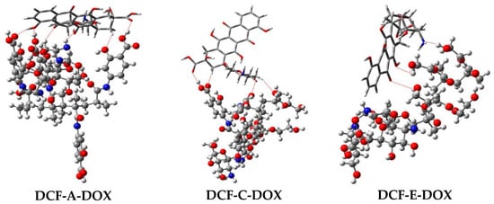 Optimized geometries of the complexes DCF-A-DOX, DCF-C-DOX, and DCF-E-DOX obtained at the M062X/6-31G(d)//M062X/3-21G level of theory. Hydrogen bonds are highlighted with red dotted lines. Doxorubicin is represented with the tube model, and the DCFs are represented with the ball and stick model.