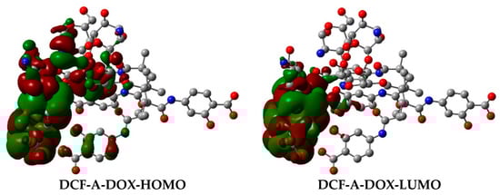 As shown in Figure 6, the high complexation energies can be attributed to the intermolecular hydrogen bonds (H-bonds) and π–π interactions formed between DOX and DCFs. It is interesting to observe that the number of H-bonds formed in each complex varies: six for DCF-A-DOX, four for DCF-C-DOX, and three for DCF-E-DOX. All H-bonds observed in complexes DCF-A-DOX and DCF-C-DOX are those formed between hydrogen and oxygen atoms, whereas in the case of complex DCF-E-DOX, two H-bonds were formed between hydrogen and oxygen atoms, and the remaining H-bond was formed between hydrogen and nitrogen atoms. In addition, as shown in Figure 7, the strong interaction between DOX and DCF is the supporting evidence of the charge transfer phenomenon observed in the frontier molecular orbitals. From the theoretical simulation results, it can be confirmed that DCF-A is the most efficient, over the other two DCFs.