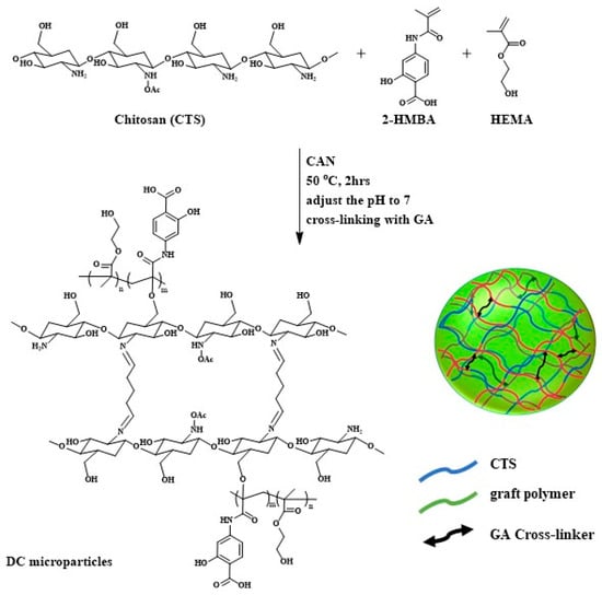 Microparticles with different drug carrier formulations (DCFs) were fabricated via redox-mediated graft copolymerization onto the linear chains of CTS, as illustrated in Scheme 1. The required amount of CTS was dissolved in 50 mL of double-distilled water and purged with nitrogen for 10 min. When the temperature reached 50 °C, the required amount of CAN was added for radical initiation on the CTS chains. Then, grafting on CTS was achieved by the addition of 10 mL of pre-dissolved monomer mixture of 2-HMBA and HEMA and continued to react for 2 h. After the polymerization was completed, the reaction solution was cooled to room temperature, and the pH of the solution was increased to 7 by adding dilute (0.5 N) sodium hydroxide solution. When the solution became opaque, a certain amount of glutaraldehyde solution was added to complete the formation of microparticles by cross-linking.
