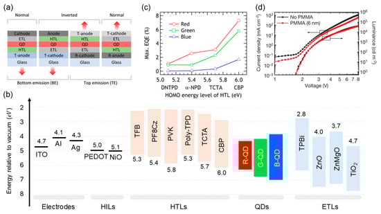 Since the first report on an electroluminescent colloidal QLED in 1994, device engineering has advanced toward improving the efficient injection of charge carriers into the QD emissive layer [5,6,7,8,9,10]. Electroluminescent QLEDs exhibit structural variations designed for specific purposes, as illustrated in Figure 2a. Centered on the QD emissive layer, hole-injection and -transport layers are positioned between the anode and QDs, whereas electron-injection and -transport layers are located between the cathode and QDs. Depending on the direction in which the emitted light exits the device, QLEDs are classified as bottom- or top-emission structures. The architecture is inherently flexible and varies based on research objectives. Efficient device operation relies on the appropriate energy-level alignment among the constituent layers. Figure 2b shows the energy-level distribution of the QDs in the visible-emission range, along with the commonly used electrodes and charge-transport layers in QLEDs. Efficient charge injection requires the offset between the conduction-band minimum of the QDs and electron-transport layer, as well as between the valence-band maximum of the QDs and hole-transport layer to be minimized. Such an alignment allows efficient electron and hole injection into the QDs under an applied electric field with minimal energy loss. The intrinsically deep valence band of QDs has made improved hole injection a key characteristic of the reported studies [11,12,13]. Accordingly, addressing the insufficient hole-injection rate relative to the more facile electron injection has been a major challenge. In 2012, Kwak et al. reported the introduction of an inverted architecture and hole-transport layers based on small molecules with deep HOMO levels, which significantly increased device efficiency (Figure 2c) [14]. The high EQE, based on the HOMO distribution of the HTL, requires the improvement of the hole-injection rate to achieve a balance with electron injection. Dai et al. reported that inserting a thin insulating polymer between the QD layer and electron-transport layer suppresses electron injection, enabling an EQE of 20% and underscoring the charge-injection balance as a key factor in device engineering (Figure 2d) [15]. Current EQEs have surpassed the theoretical limits, with reported values of 30.9%, 28.7%, and 21.9% for red, green, and blue emissions, respectively [16,17]. Moreover, employing a top-emission architecture along with a light-scattering layer can boost the EQE to 44.5% [18]. Furthermore, the introduction of tandem structures results in an EQE of 51.2% [19]. QLEDs have been commercialized as light sources because of their highly efficient emission characteristics.