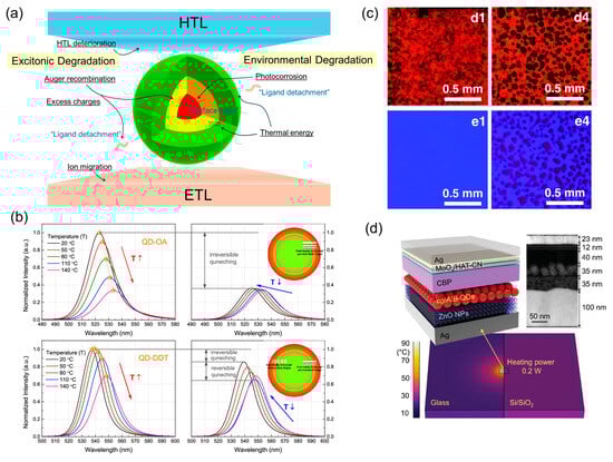 The nanoscale dimensions of the QDs contribute to their degradation owing to the potential formation of structural leakage paths (Figure 4d). For example, when ZnO nanoparticles (approximately 5 nm) are deposited on QDs (approximately 10 nm), they can penetrate the QDs and make direct contact with the HTL. This may create shunt paths, leading to a leakage current and Joule heating, thereby accelerating device degradation [70,71].