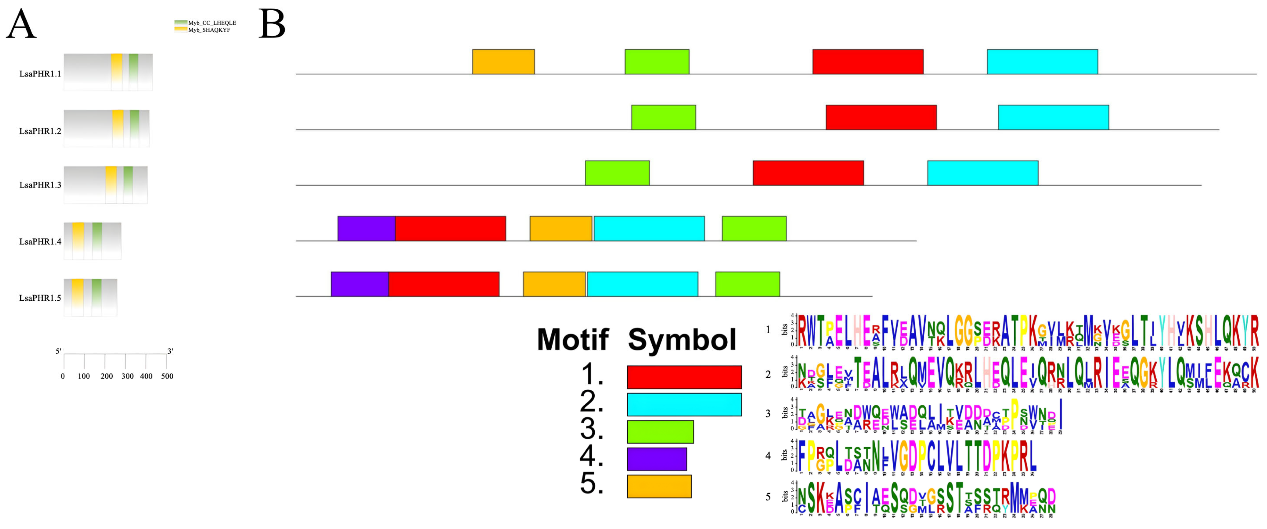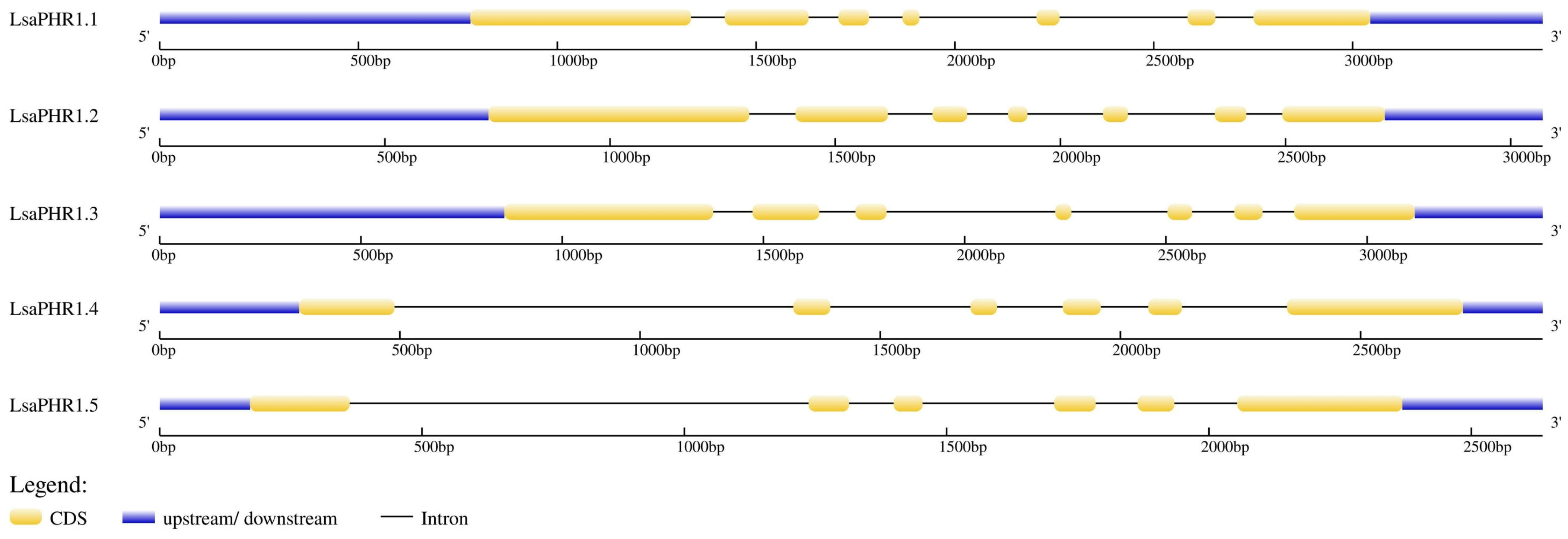 4.2. Identification and Characterization of the LsaPHR1 Gene Family