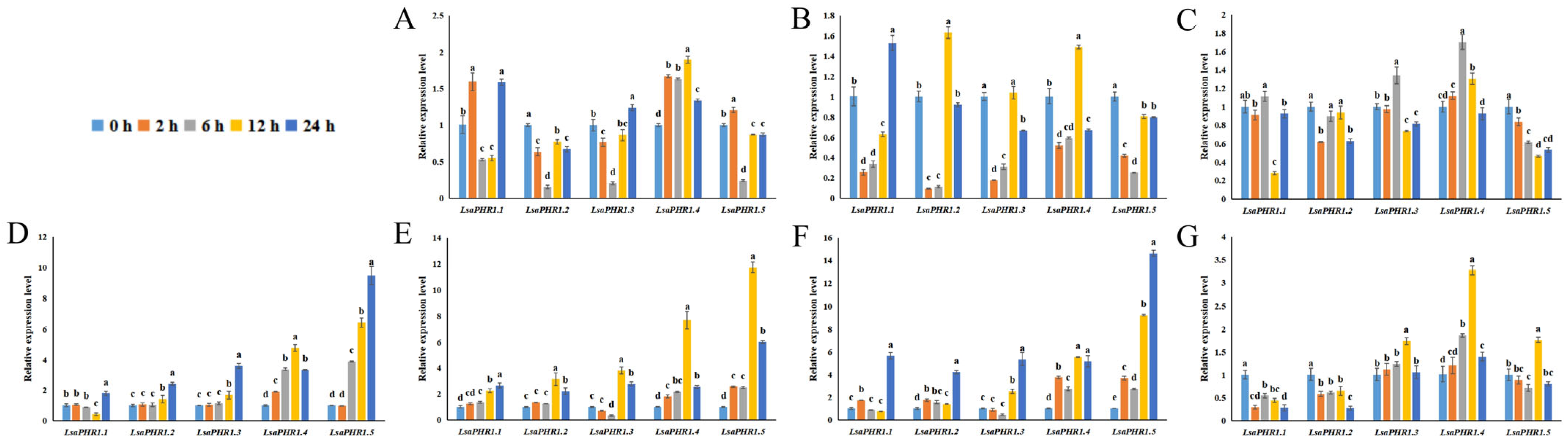 2.5. Expression Patterns of LsaPHR1s Under Phosphate, Phytohormone, and Dark Treatments