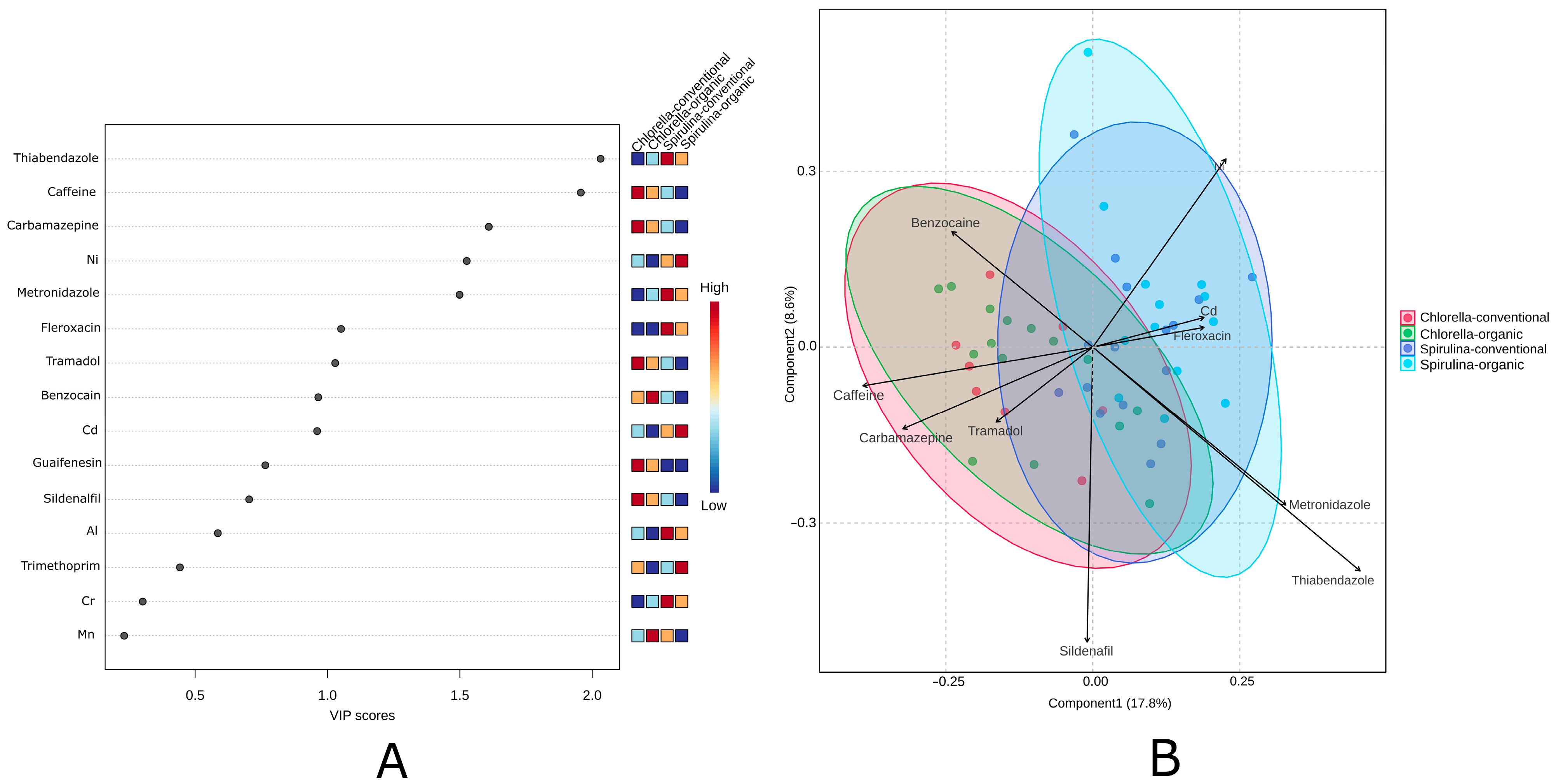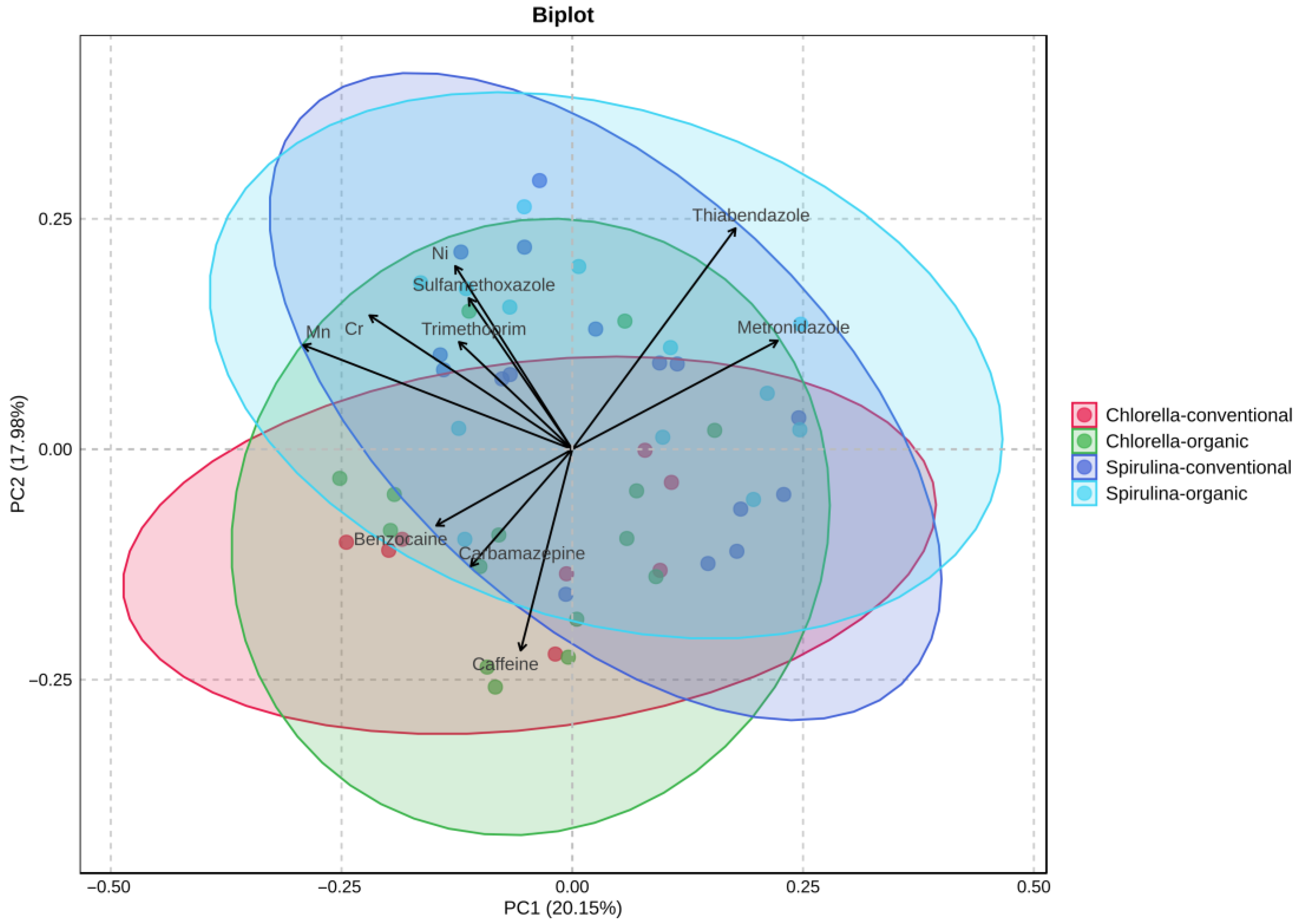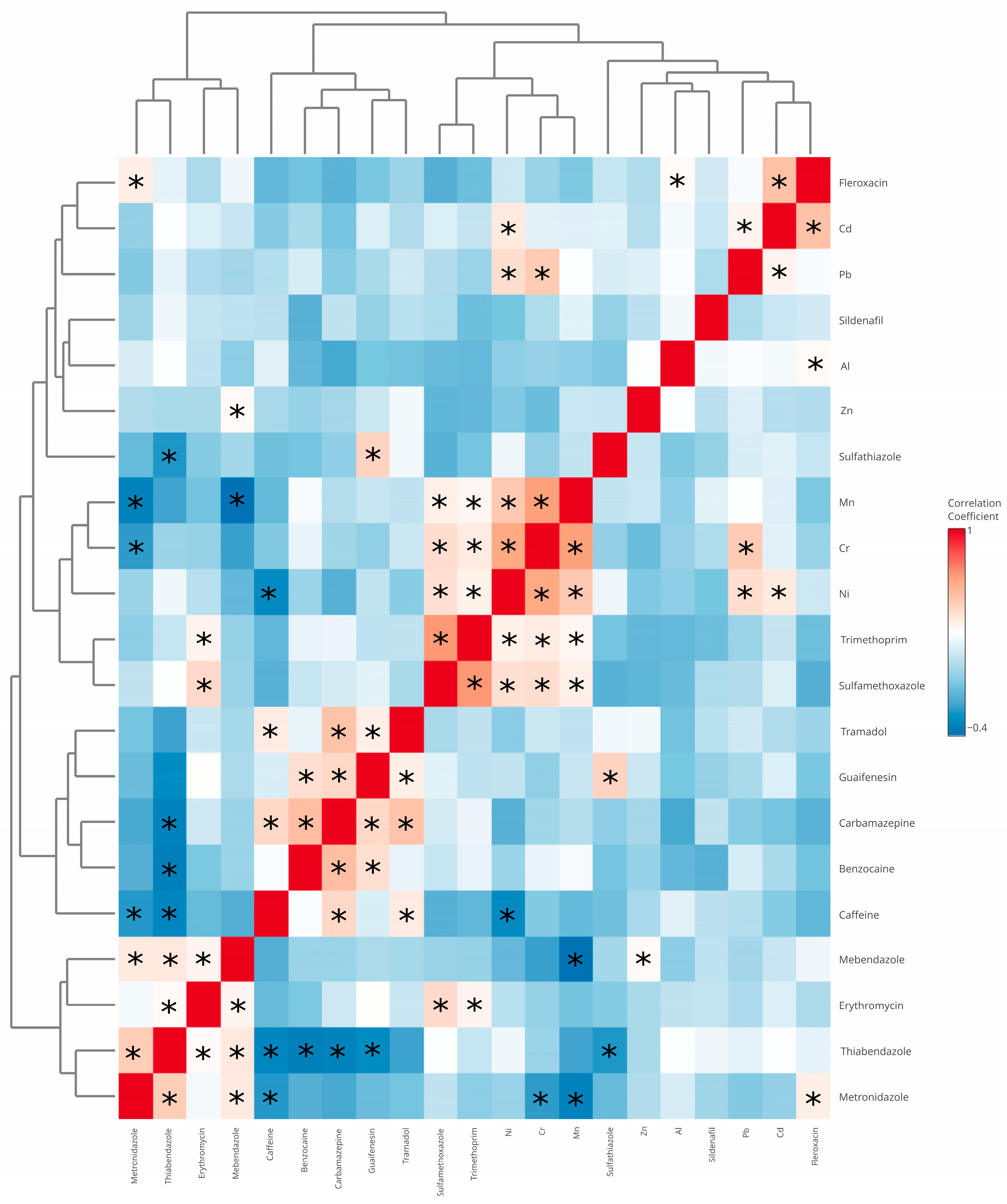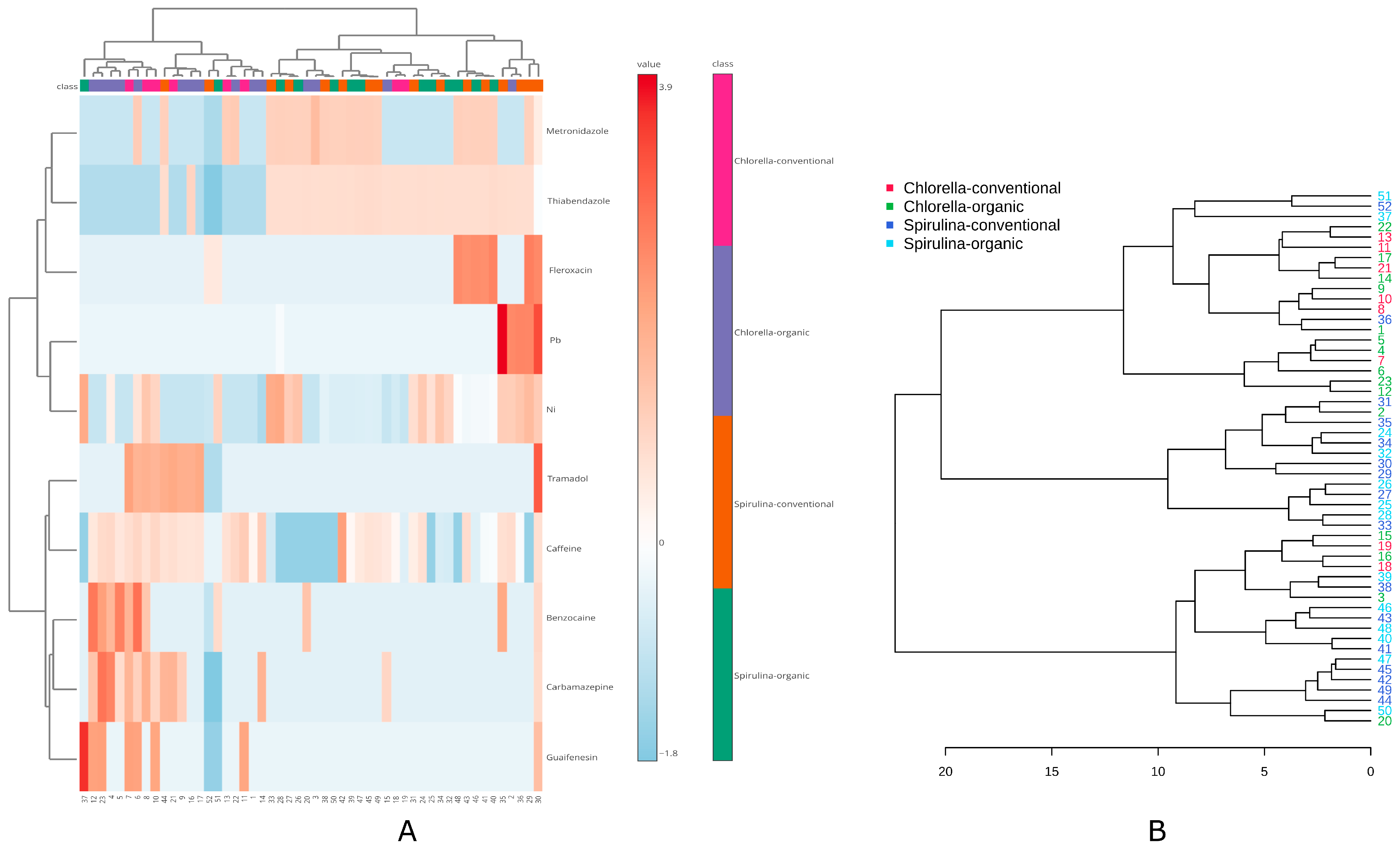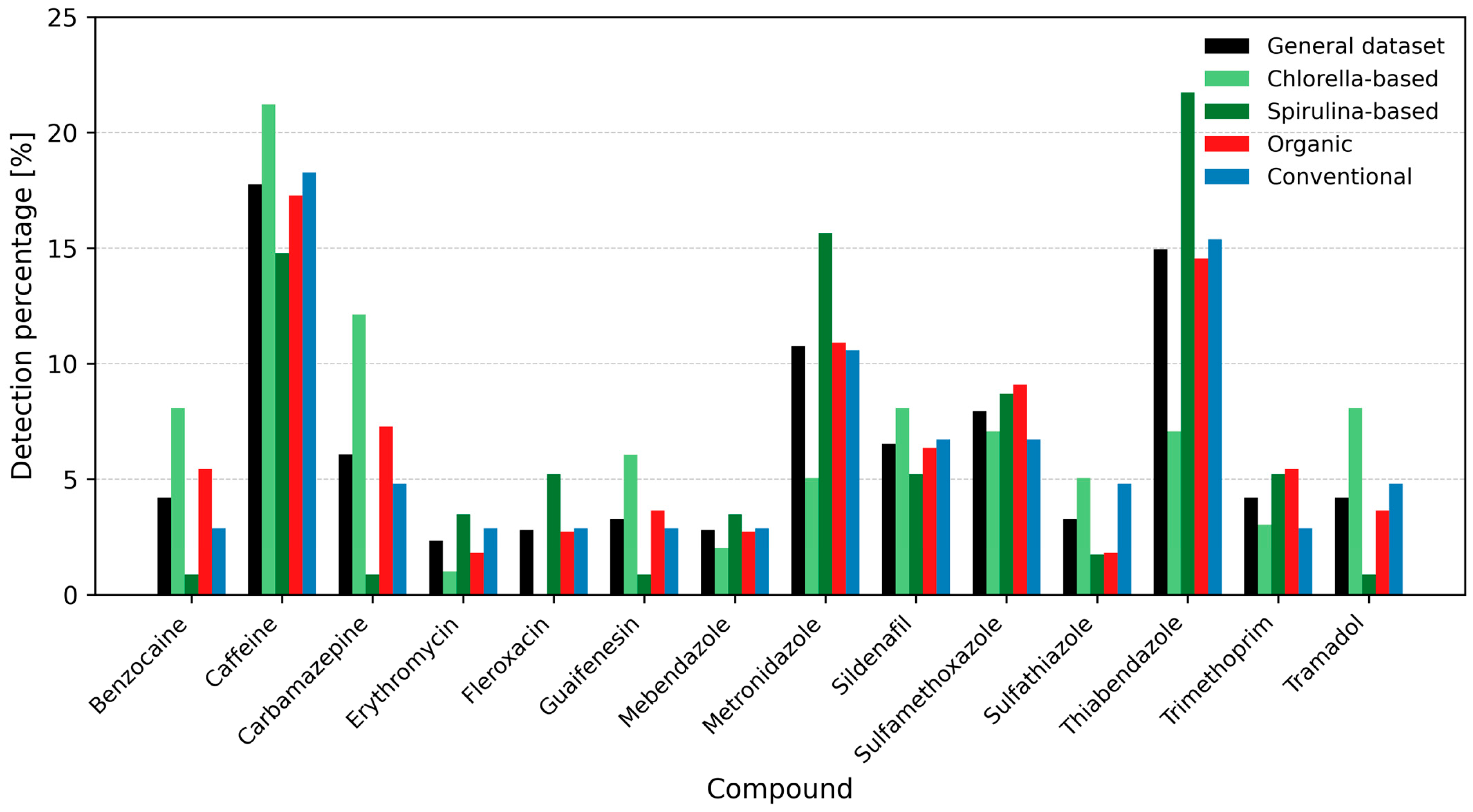 2.3. Comprehensive Assessment of Pharmaceuticals and Metals of Algae-Based Samples