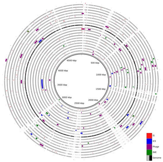 The study focused on integrative and conjugative elements (ICEs), integrative and mobilizable elements (IMEs), prophages, and insertion sequences (ISs). ICEfinder 2.0 [] was used for ICE and IME prediction. The ICEfinder output provides the number of ICEs and IMEs predicted in a genome, genomic regions, sequences, and annotations. PHASTEST [] was selected for prophage prediction as it used advanced neural network models, which can identify subtle sequence features that traditional tools might not be able to detect. Additionally, PHASTEST can analyze both complete and draft genomes. The tool was executed in “deep” mode to enhance detection accuracy []. The PHASTEST output included prophage classifications as either intact, incomplete, or questionable, along with their genomic regions, sequences, and sequence annotations. Only intact and incomplete prophages were selected for downstream analysis because they are more likely to represent functional or nearly functional prophages []. ISs were predicted using ISEScan 1.7.3 []. The tool uses Hidden Markov Models (HMMs) to identify and classify IS elements into families based on transposase profile. The ISEScan output details the genomic start and stop coordinates, strand, and family classification for each predicted IS. All the predictions were executed locally on an Ubuntu server.