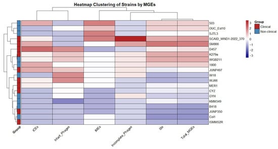 There were no plasmid elements predicted in the genomes. A hierarchical clustering was performed based on the frequency of ICEs, IMEs, phages, and ISs, which grouped the 20 strains into several distinct clades based on their MGE profiles. The comparison of total MGEs between clinical (n = 10) and non-clinical strains (n = 10) showed no significant difference (U = 56, p = 0.68) (Figure 2), with a very small effect size (r = 0.10). This suggests that the overall MGE burden, as measured by the total count of these elements, is similar across clinical and non-clinical isolates in this dataset.