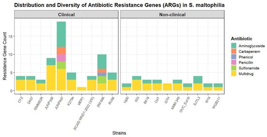 Distribution and diversity of antibiotic resistance genes (ARGs) in S. maltophilia strains. The stacked bar plot shows the total number and diversity of ARGs identified in each of the 20 S. maltophilia genomes, grouped by isolation source into clinical and non-clinical cohorts.
