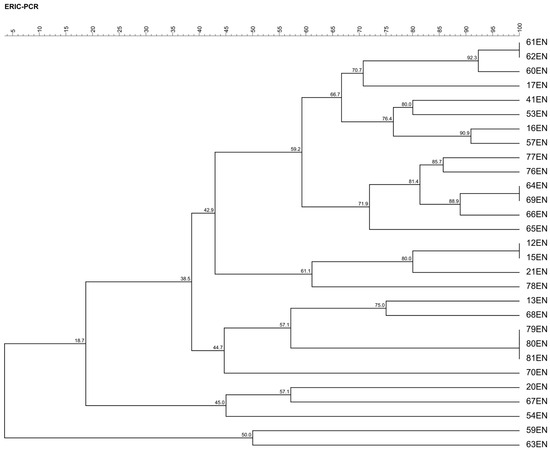 The dendrogram obtained from ERIC-PCR analysis, constructed using the UPGMA (unweighted pair group method with arithmetic mean) algorithm, shows the hierarchical structure of genetic similarity between the E. faecalis strains studied (Figure 1). Similarity levels ranged from 18.7% to 100%, indicating the presence of both closely related and genetically distinct strains. The highest similarity (100%) was observed between strain pairs 12EN and 15EN, 61EN and 62EN, 64EN and 69EN, and 79EN, 80EN and 81EN, suggesting potential clonal origin or very recent common ancestry. At a similarity threshold of approximately 60%, the dendrogram reveals the presence of distinct genetic clusters, highlighting potential differences in evolutionary divergence among the strains. Notably, no clear relationship was observed between clustering patterns and the geographic origin of the isolates (Warmian–Masurian vs. Kuyavian–Pomeranian Voivodeships), suggesting that genetic variability may be influenced by other factors such as environmental conditions, farm-level practices, or selective pressure.