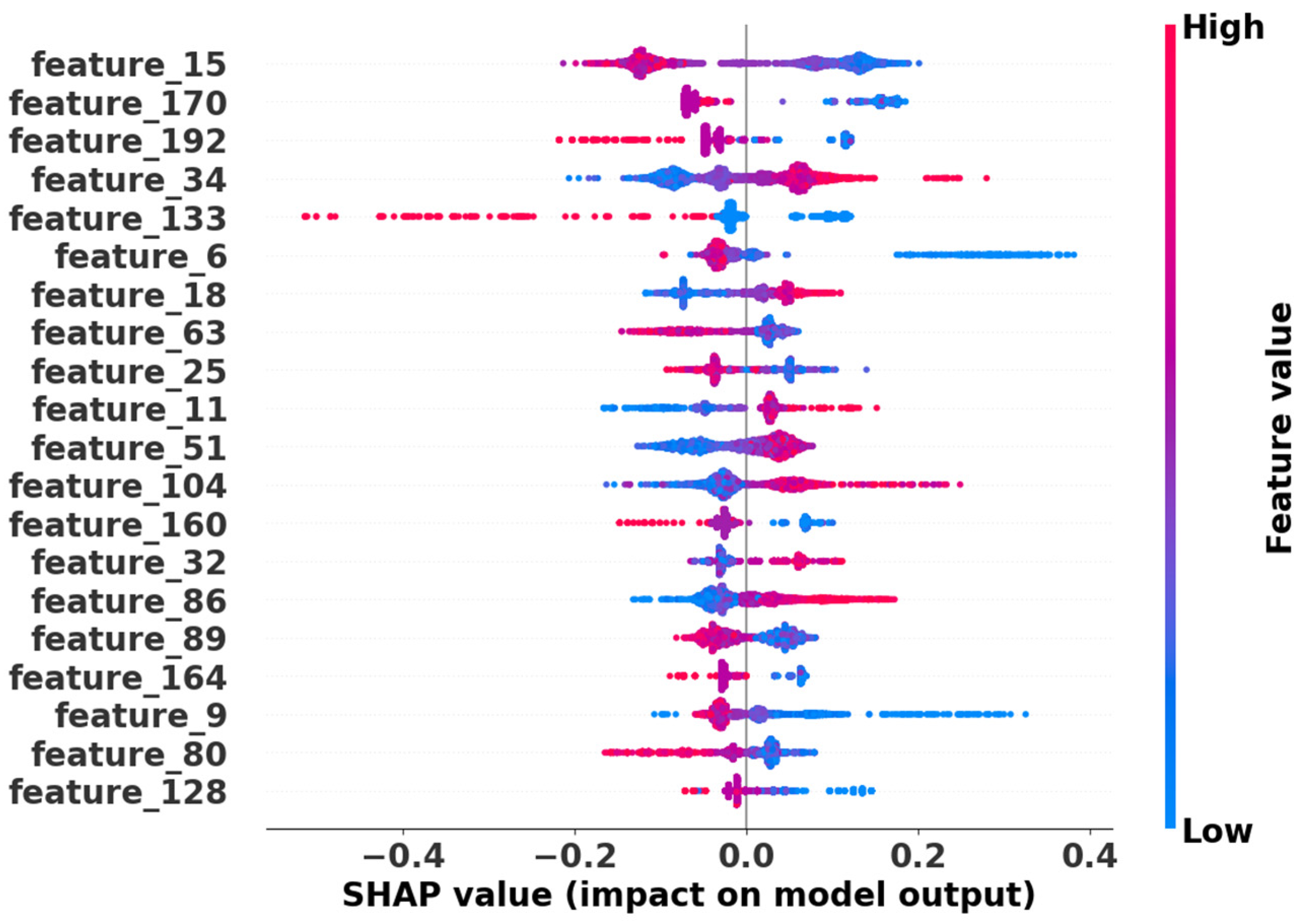 Our analysis identified distinct patterns of feature contributions: for features showing positive correlation (e.g., Feature 34, 11, and 86), red points (high feature values) cluster on the right (positive SHAP values) and blue points on the left, indicating that higher feature values increase interaction probability. Conversely, for features showing negative correlation (e.g., Feature 192, 133, and 160), red points concentrate on the left while blue points are distributed on the right, suggesting that higher feature values decrease prediction scores.