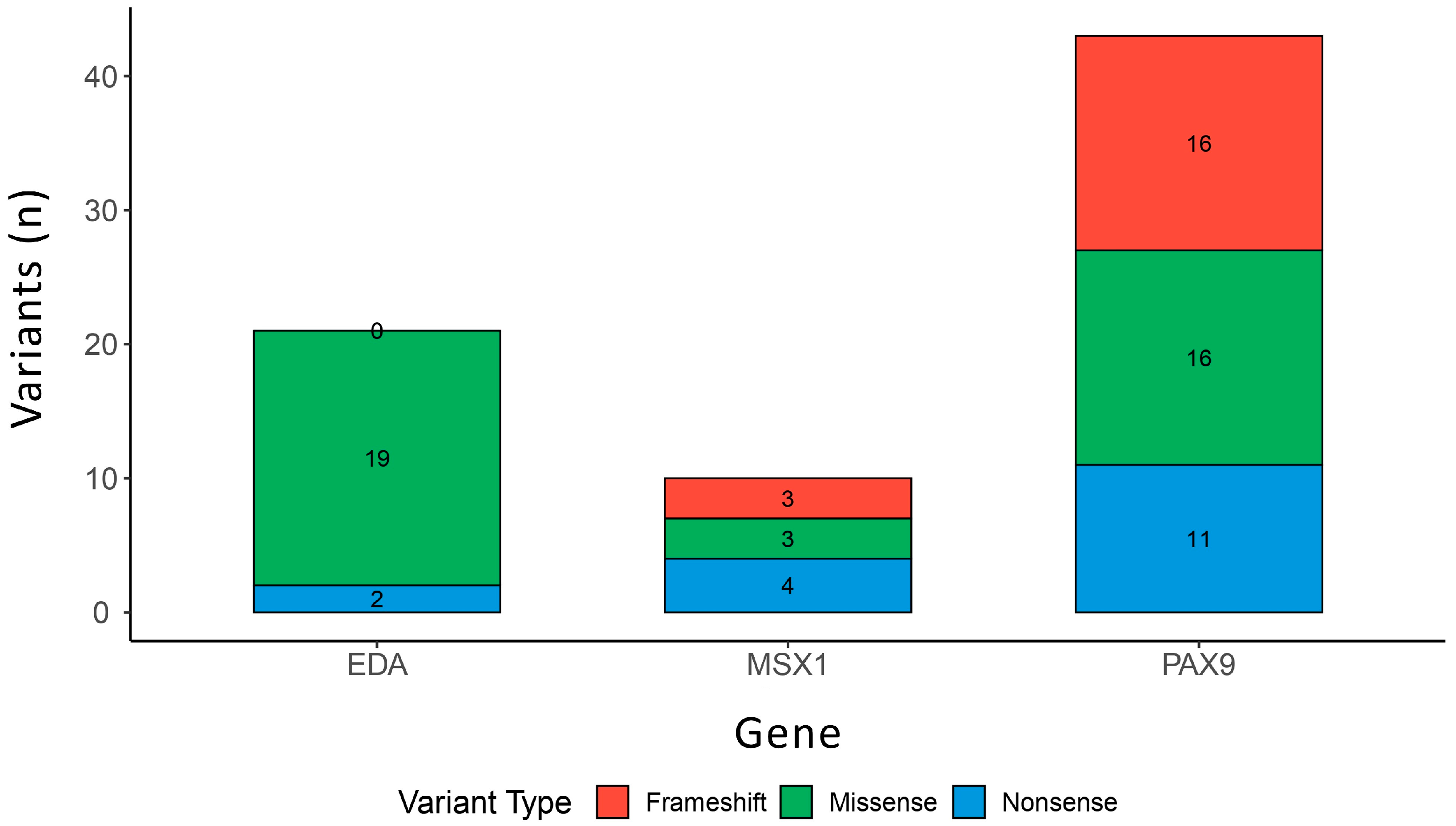 - Lan, R.; Wu, Y.; Dai, Q.; Wang, F. Gene Mutations and Chromosomal Abnormalities in Syndromes with Tooth Agenesis. Oral Dis. 2023, 29, 2401–2408. [Google Scholar] [CrossRef]