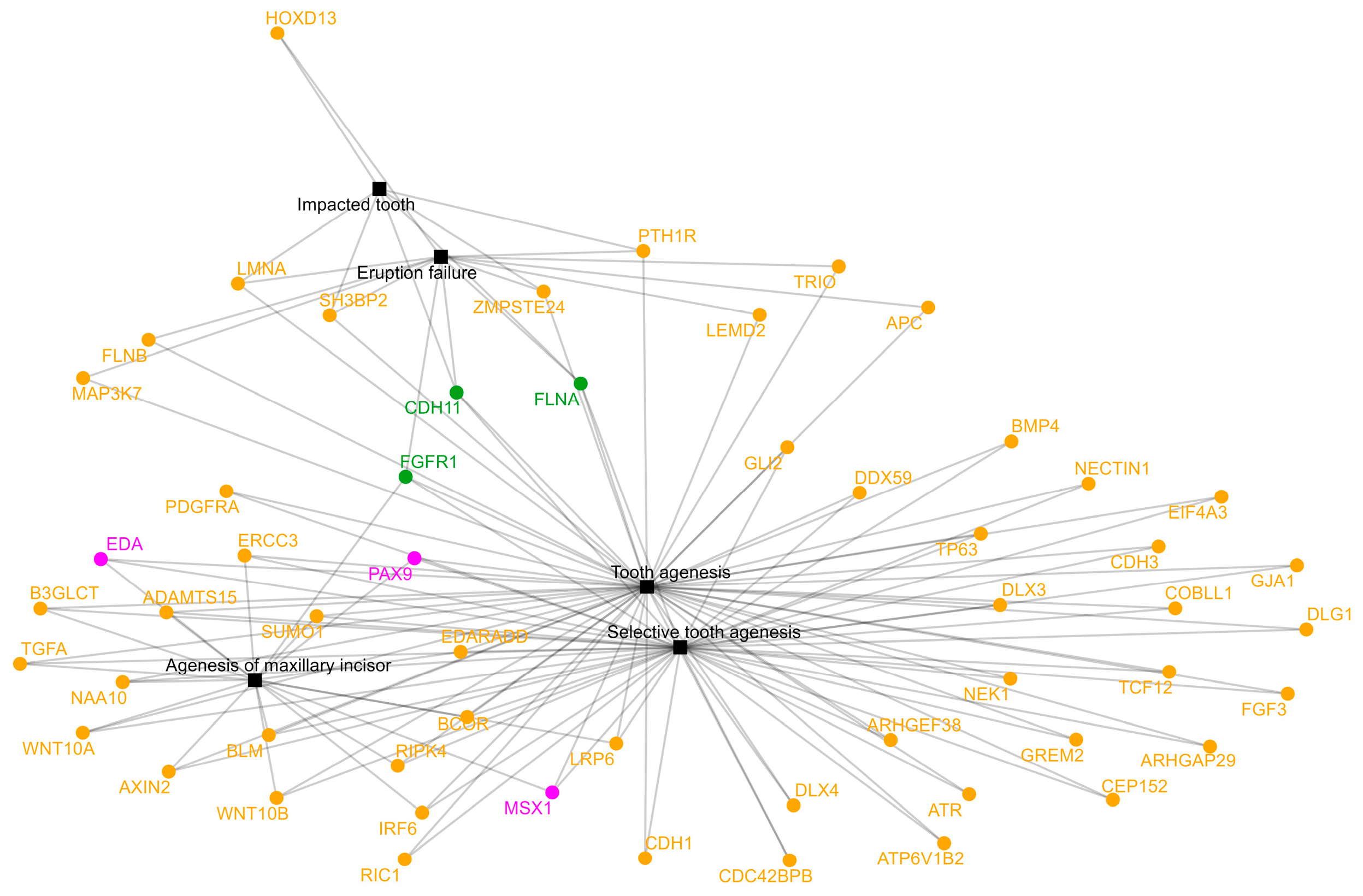 - Arthrogryposis, distal type 12 (OMIM: 620545) is caused by homozygous mutations in ADAMTS15 (11q25) and is associated with craniofacial and skeletal anomalies together with tooth agenesis, particularly involving the maxillary incisors.