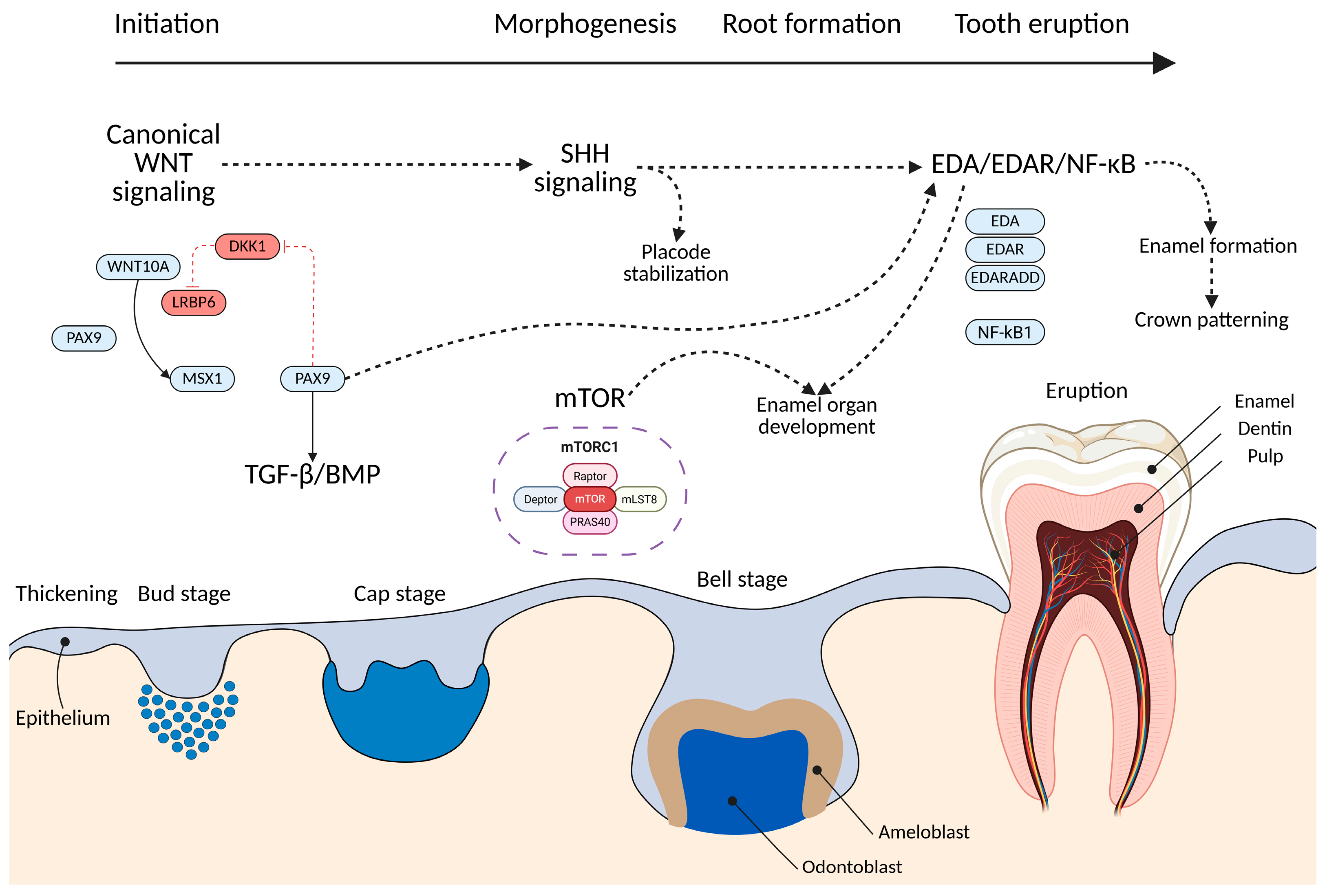 - Nie, X.; Zheng, J.; Cruciger, M.; Yang, P.; Mao, J.J. mTOR Plays a Pivotal Role in Multiple Processes of Enamel Organ Development Principally through the mTORC1 Pathway and in Part via Regulating Cytoskeleton Dynamics. Dev. Biol. 2020, 467, 77–87. [Google Scholar] [CrossRef] [PubMed]