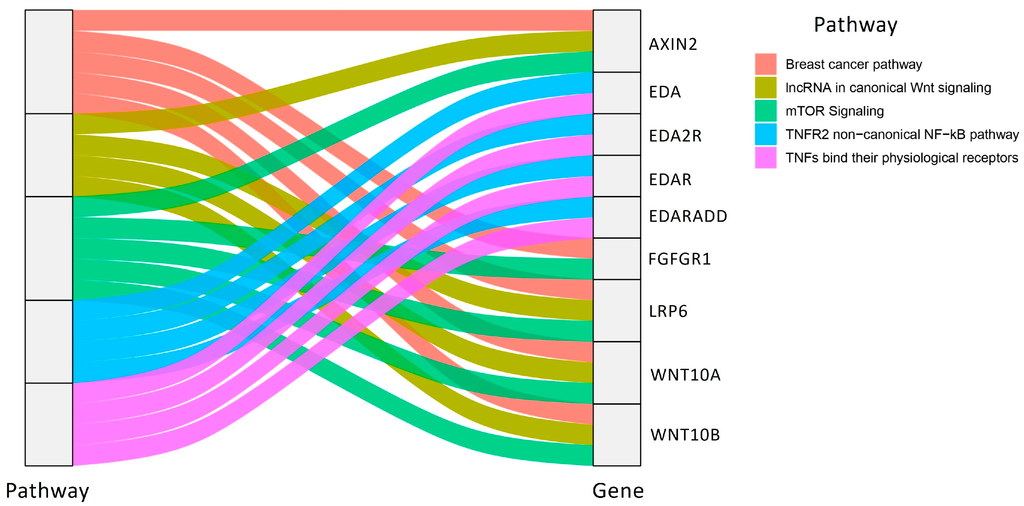 | Breast cancer pathway | 5/154 | 5.4 | AXIN2, FGFR1, LRP6, WNT10A, WNT10B |