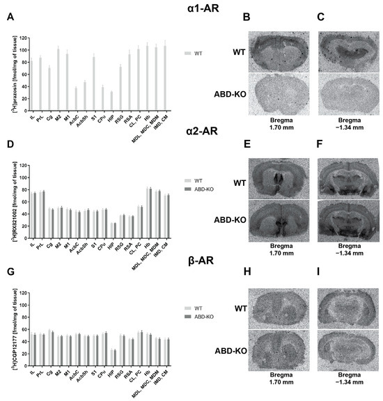 In the case of α1-AR density measurements in ABD-KO mice, a signal originating exclusively from non-specific background binding was observed (Figure 1B,C, lower panels). The absence of specific signals in the analyzed brain structures of ABD-KO mice indicates either an absence or trace amounts of [3H]-prazosin binding sites, confirming the effectiveness of the mutation-induced inactivation of all three subtypes of α1-AR. The bars in Figure 1A depict the α1-AR density level in the brains of only WT controls. Significantly, the ABD-KO mutation did not affect the density of α2-AR (Figure 1D–F) and β-AR (Figure 1G–I), which did not differ from the density of these receptors in the examined brain structures of the WT control mice.