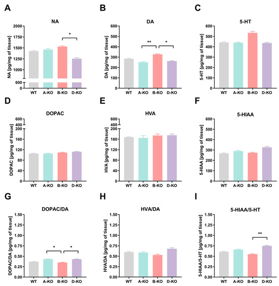 The characterization of mouse transgenic lines A-KO, B-KO, and D-KO began with examining the effects of mutations on levels of noradrenaline, dopamine, its metabolites such as 3,4-dihydroxyphenylacetic acid (DOPAC) and homovanillic acid (HVA), as well as serotonin and its metabolite 5-hydroxyindoleacetic acid (5-HIAA) in the HY of male mice. The tissue levels of neurotransmitters were measured using ultra-high-performance liquid chromatography (UHPLC) with coulochemical detection (Figure 2A–F). Additionally, the results were presented as ratios of metabolite concentrations to their corresponding analytes, allowing for the assessment of how the mutations affected neurotransmitter levels and their metabolism (turnover) in the examined tissues (Figure 2G–I).