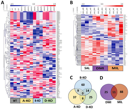 The impact of mutations and repeated administration of DMI or MIL on gene expression profiles in the hippocampus of A-KO, B-KO, and D-KO mice was investigated using DNA microarray technology. The data are presented as heat maps illustrating gene expression patterns (Figure 4).