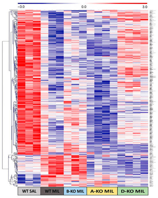 Due to the markedly more significant effect at the transcriptomic level of multiple administrations of MIL compared to DMI, the impact of deleting individual α1-AR subtypes and antidepressant drugs action on gene expression profiles in the hippocampus of mice was decided to be presented in more detail using the example of MIL results (Figure 5). Analysis of gene expression patterns corresponding to transcripts significantly regulated by MIL in WT mice (WT MIL group) and WT (WT sal) and A-KO, B-KO, and D-KO mice receiving MIL administrations indicates the abolition of drug effects due to deletion of α1D-AR, with these changes not observed in the case of α1A-AR or α1B-AR deletions. Furthermore, the gene expression profile in B-KO mice after MIL administration is notably similar to the gene expression profile in WT mice after MIL administration, suggesting that at the transcriptomic level, the α1B subtype (unlike the α1D subtype) does not influence the effects of MIL observed in WT mice compared to WT mice.